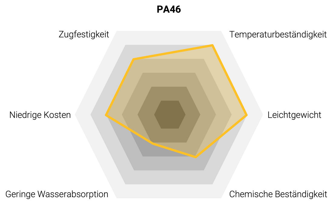PA46 MaterialEin hochtemperaturbeständiges Nylon mit überlegener mechanischer Festigkeit und Steifheit im Vergleich zu herkömmlichen Polyamiden. PA46 wird in Motorraumkomponenten, Elektronik und industriellen Anwendungen im Automobilbereich eingesetzt, bei denen Hitze- und Verschleißfestigkeit von entscheidender Bedeutung sind. Es weist außerdem eine gute chemische Beständigkeit und Dimensionsstabilität auf.