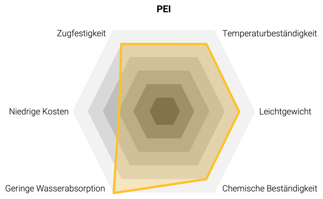 PEI MaterialEin hochfester Thermoplast mit ausgezeichneter Flammhemmung, Hitzebeständigkeit und Dimensionsstabilität. PEI wird in Anwendungen eingesetzt, die Festigkeit und Leistung bei erhöhten Temperaturen erfordern, wie etwa in der Luft- und Raumfahrt, der Automobilindustrie und bei medizinischen Geräten. Es bietet außerdem eine gute elektrische Isolierung und chemische Beständigkeit.