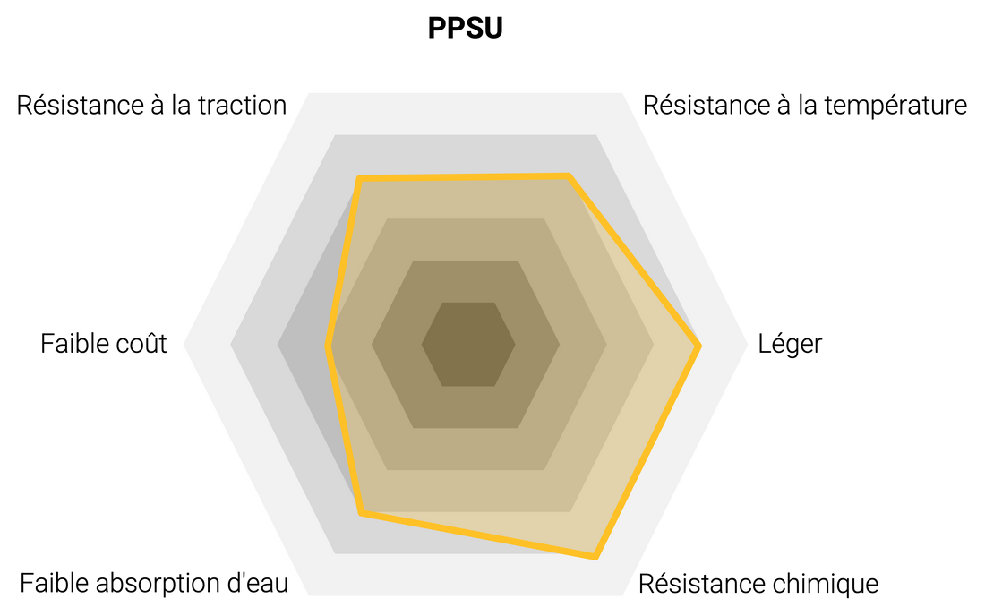 Le polyphénylsulfone (PPSU) est un thermoplastique hautes performances réputé pour sa stabilité thermique, sa résistance mécanique et sa résistance à l'hydrolyse exceptionnelles. Il résiste à des températures d'utilisation continue allant jusqu'à 200 °C. La résistance au feu inhérente au PPSU et son excellente résistance chimique le rendent adapté aux applications exigeantes dans les dispositifs médicaux, les intérieurs aérospatiaux et les composants de plomberie. Sa robustesse et sa résistance aux chocs supérieures améliorent encore sa fiabilité dans les environnements critiques.