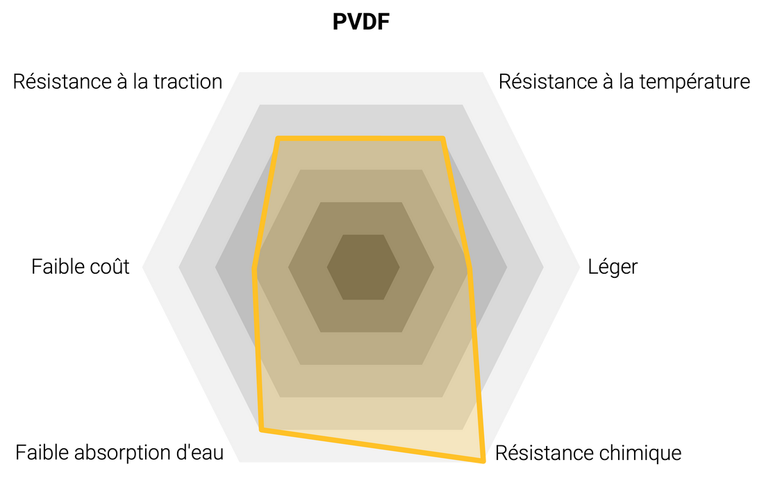 Matériau PVDFLe polyfluorure de vinylidène (PVDF) est un fluoropolymère hautes performances connu pour sa résistance chimique, sa résistance mécanique et sa stabilité thermique exceptionnelles. Il fonctionne bien sur une large plage de températures, ce qui le rend idéal pour les applications exigeantes dans le traitement chimique, l'électronique et les appareils médicaux. Le PVDF est également apprécié pour ses excellentes propriétés d'isolation électrique et sa résistance inhérente aux flammes. Ces attributs en font un matériau privilégié pour les industries exigeant durabilité, haute pureté et performances fiables.