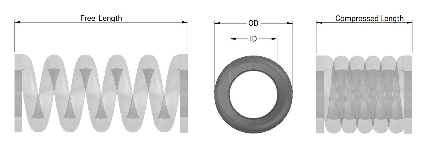 Dimensions for Polycarbonate Compression Springs in all available sizes are shown according to the product drawing above.